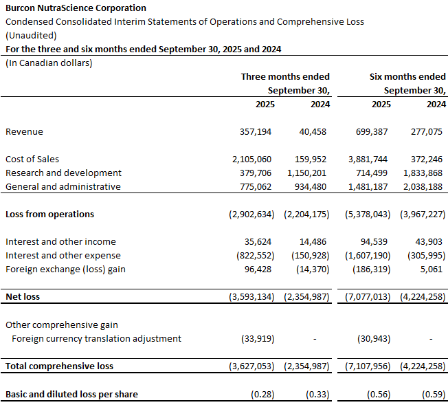 In the three and six months ended September 30, 2025, Burcon generated revenue of $357,000 and $699,000, respectively, which represents a 783% and 152% increase in revenues from the prior year comparable periods. The increase in revenue is a result of protein sales and the provision of contract manufacturing services at the Galesburg production facility.